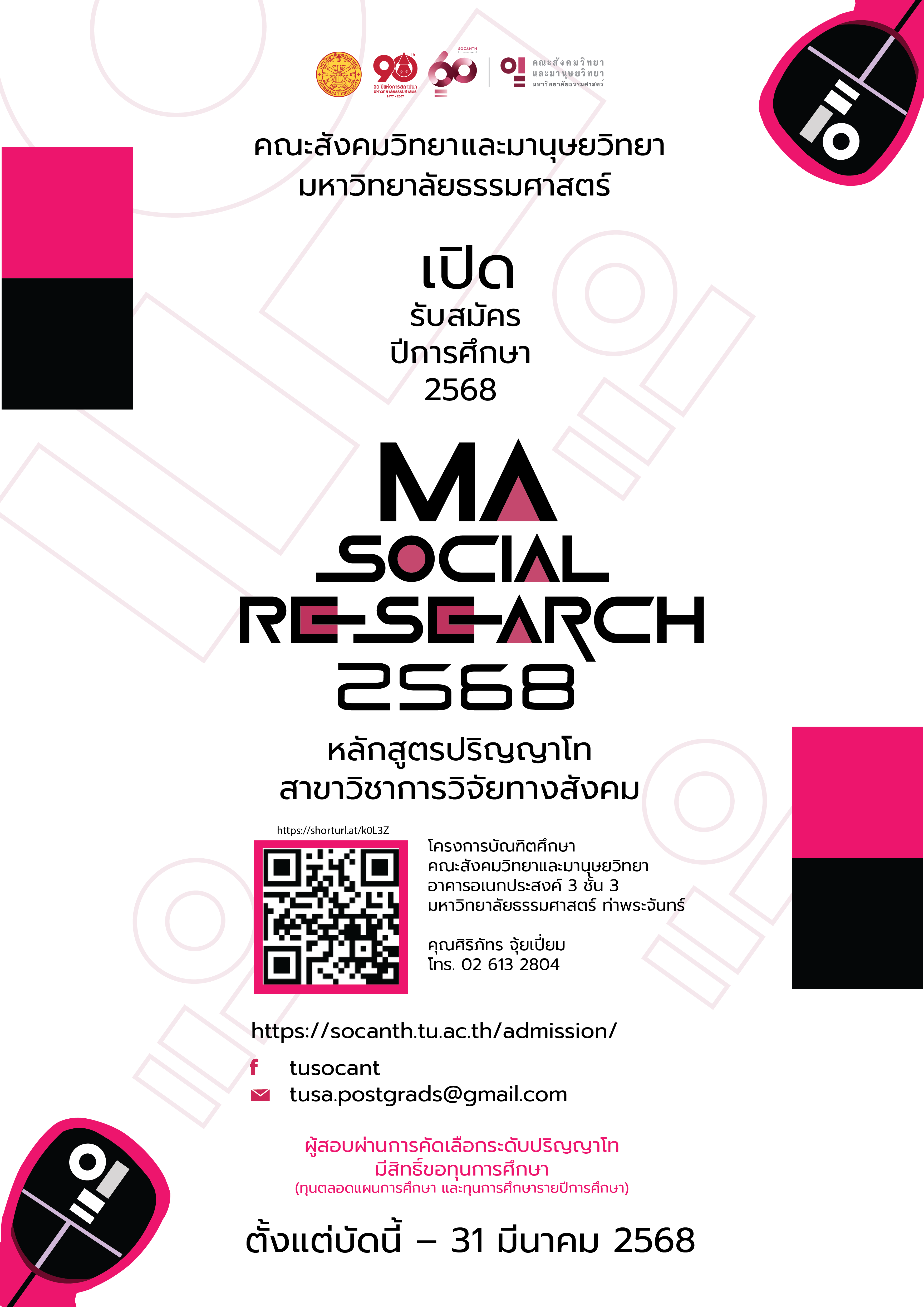 - 19 พ.ค.68 ประกาศรายชื่อผู้สอบผ่านการสอบสัมภาษณ์ ระดับปริญญาโท สาขาวิชาการวิจัยทางสังคม ปีการศึกษา 2568 [อ่าน]