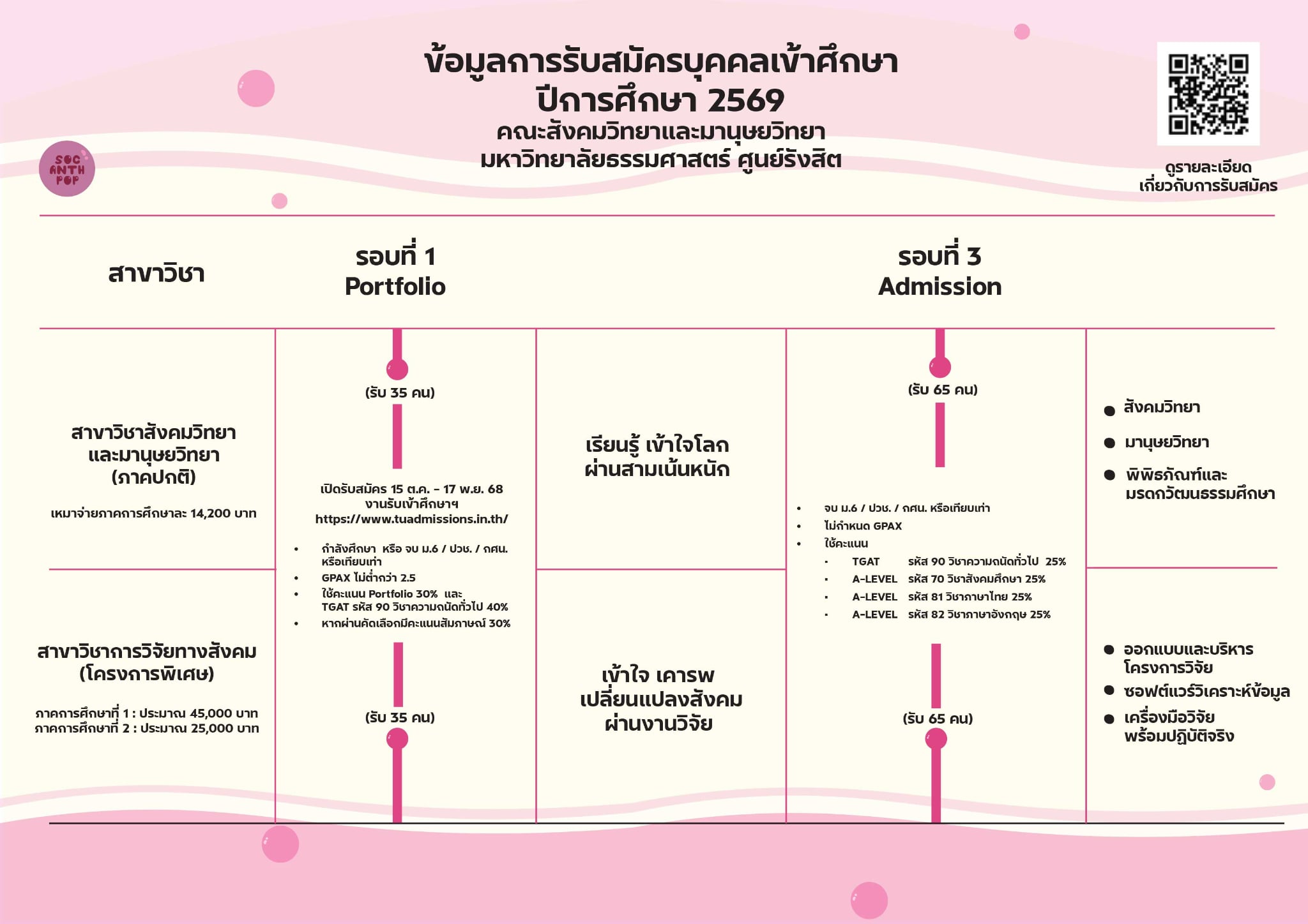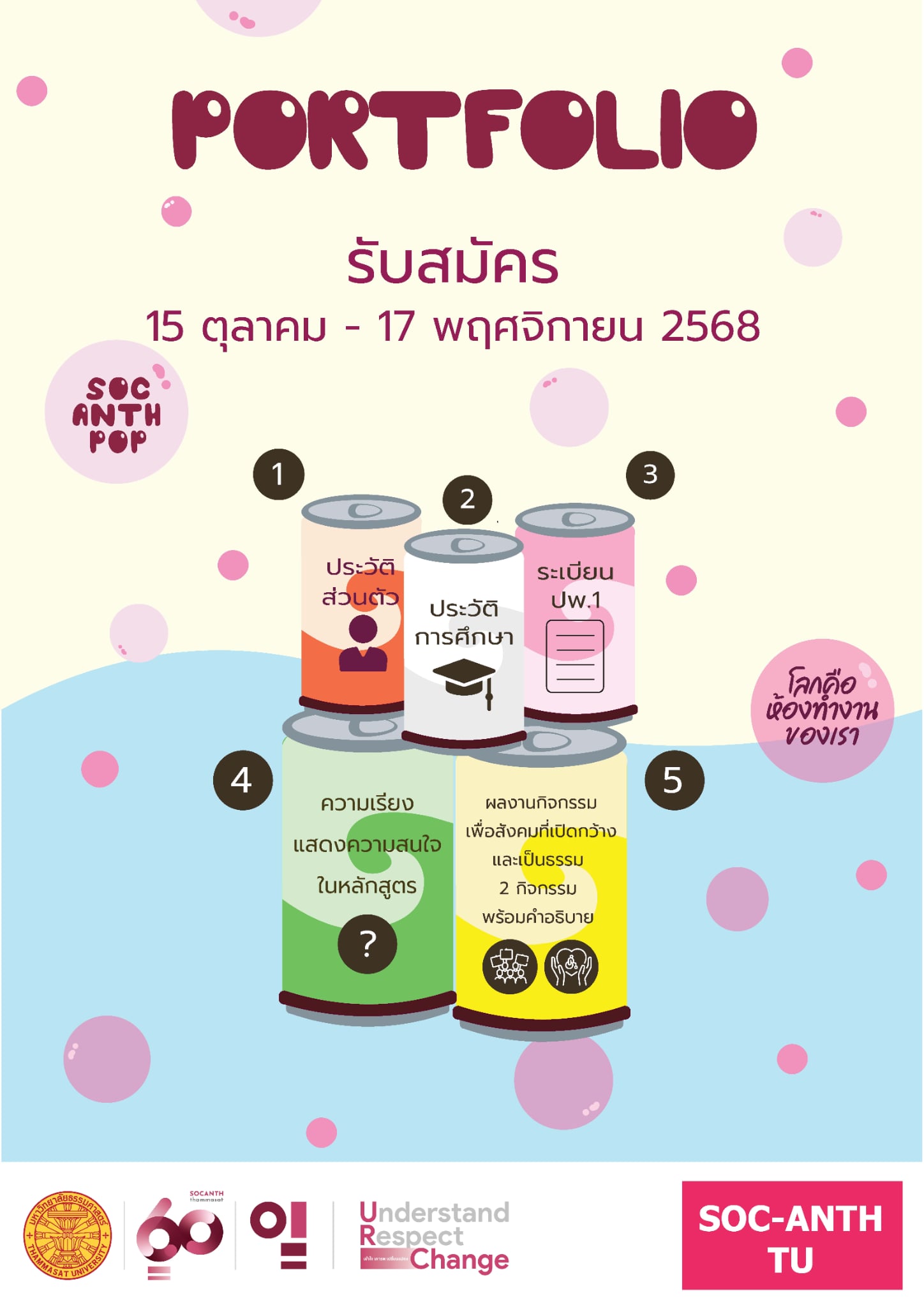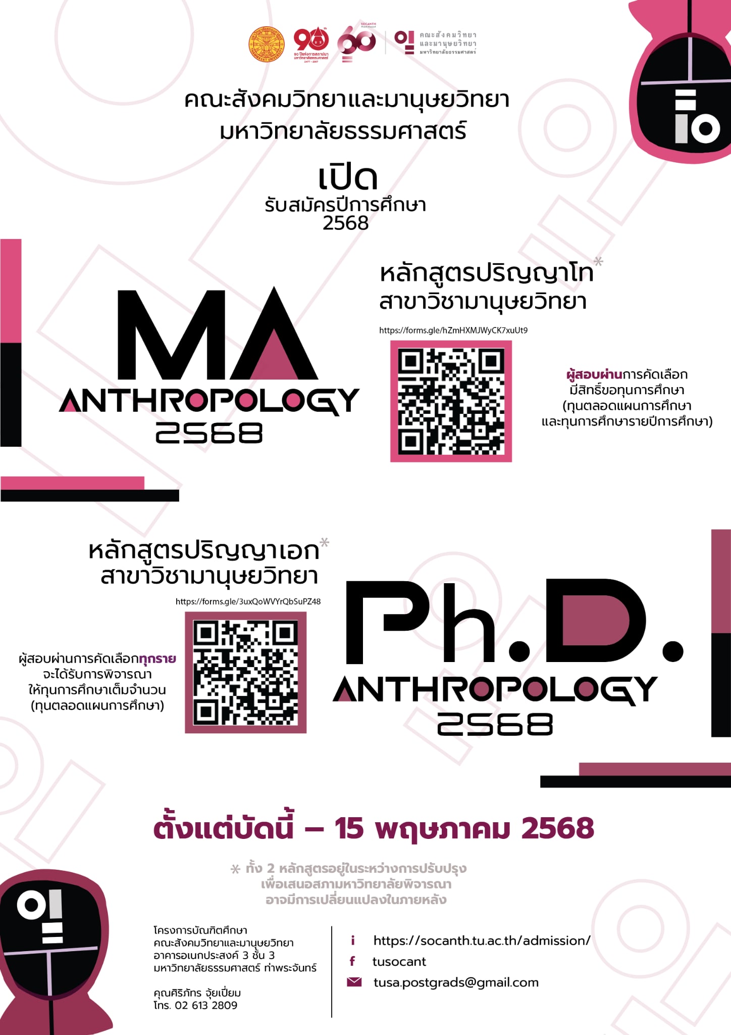 - 30 มิ.ย.68 ประกาศรายชื่อผู้มีสิทธิ์เข้าศึกษา ระดับปริญญาเอก สาขาวิชามานุษยวิทยา ปีการศึกษา 2568 [อ่าน]