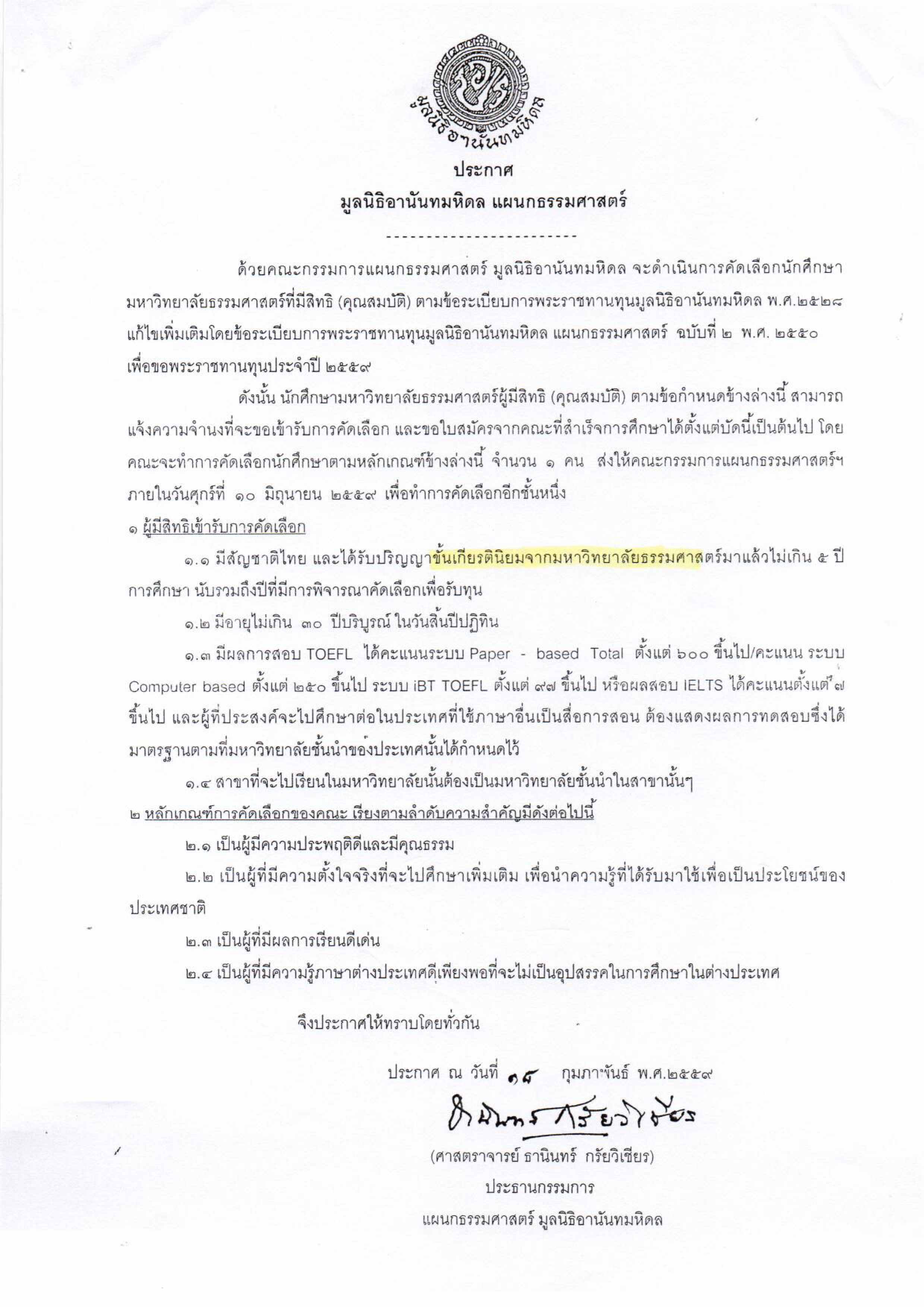 ด้วยคณะกรรมการแผนกธรรมศาสตร์ มูลนิธิอานันทมหิดล จะดำเนินการคัดเลือกนักศึกษามหาวิทยาลัยธรรมศาสตร์เพื่อรับพระราชทานทุนอานันทมหิดล ประจำปี 2559