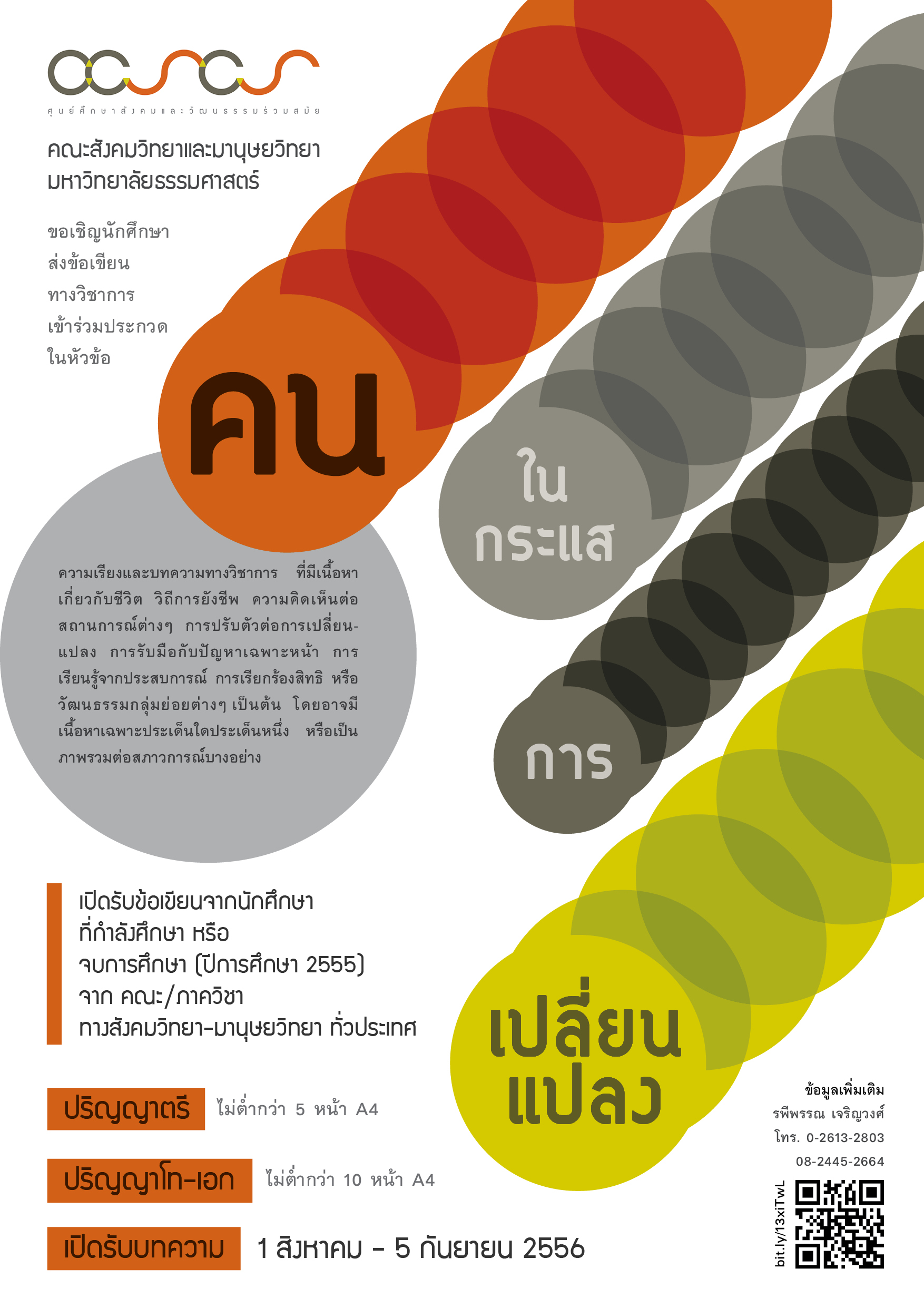 ศูนย์ศึกษาสังคมและวัฒนธรรมร่วมสมัย คณะสังคมวิทยาและมานุษยวิทยา มหาวิทยาลัยธรรมศาสตร์ ขอแสดงความยินดีกับนักศึกษาที่ได้รับรางวัลการประกวดบทความหัวข้อ “คน” ในกระแสการเปลี่ยนแปลง ทุกท่าน กิจกรรมนี้มีวัตถุประสงค์ให้นักศึกษาสาขาสังคมวิทยาและมานุษยวิทยารวมทั้งสาขาวิชาอื่นที่เกี่ยวข้องได้มีส่วนร่วมในงานสัมมนาประจำปี 2556 ของศูนย์ฯ เป็นการสนับสนุนให้นักศึกษาได้วิเคราะห์ความเปลี่ยนแปลงที่เกิดขึ้นกับคนในสังคมร่วมสมัยในแง่มุมอันหลากหลาย ทั้งในส่วนที่เป็นปัญหาและความท้าทายและในส่วนที่เป็นโอกาสและความเป็นไปได้แบบใหม่ โดยนักศึกษาที่ได้รับรางวัลได้แสดงให้เห็นว่าความเปลี่ยนแปลงในสังคมร่วมสมัยประกอบด้วยสิ่งใดบ้างและส่งผลกระทบต่อชีวิตคนอย่างไร ขณะเดียวกันพวกเขาได้แสดงให้เห็นว่าคนในสังคมร่วมสมัยได้ต่อสู้ดิ้นรนรวมทั้งพยายามใช้ประโยชน์จากความเปลี่ยนแปลงดังกล่าวอย่างไรด้วย ศูนย์ฯ หวังเป็นอย่างยิ่งว่าการมีส่วนร่วมและได้รับรางวัลจากกิจกรรมการประกวดบทความในงานสัมมนาประจำปีของศูนย์ฯ ครั้งนี้จะเป็นแรงกระตุ้นให้นักศึกษาได้ทำการศึกษาค้นคว้าชีวิตคนในกระแสการเปลี่ยนแปลงโดยละเอียดและลึกซึ้งยิ่งขึ้นในลำดับต่อไป