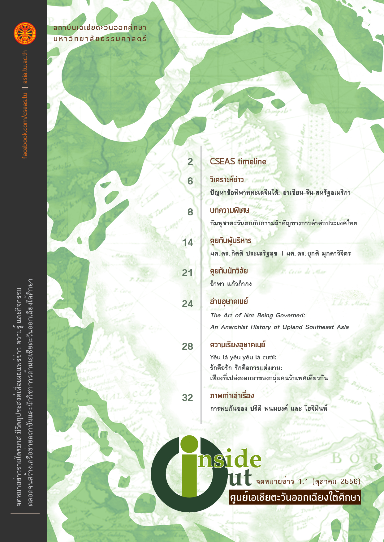 Inside Out เสนอข่าวสารเกี่ยวกับเอเชียตะวันออกเฉียงใต้ศึกษาของมหาวิทยาลัยธรรมศาสตร์ สรุปวิเคราะห์ข่าวสารที่น่าสนใจเกี่ยวกับภูมิภาคนี้ ตลอดจนแนะนำความรู้ใหม่ๆ เกี่ยวกับภูมิภาคเอเชียตะวันออกเฉียงใต้ Inside Out จัดทำโดยนักวิชาการและกรรมการประจำศูนย์เอเชียตะวันออกเฉียงใตศึกษา Inside Out เผยแพร่ทางสื่อออนไลน์ทุกสามเดือน โปรดติดตามได้ทาง facebook.com/cseas.tu