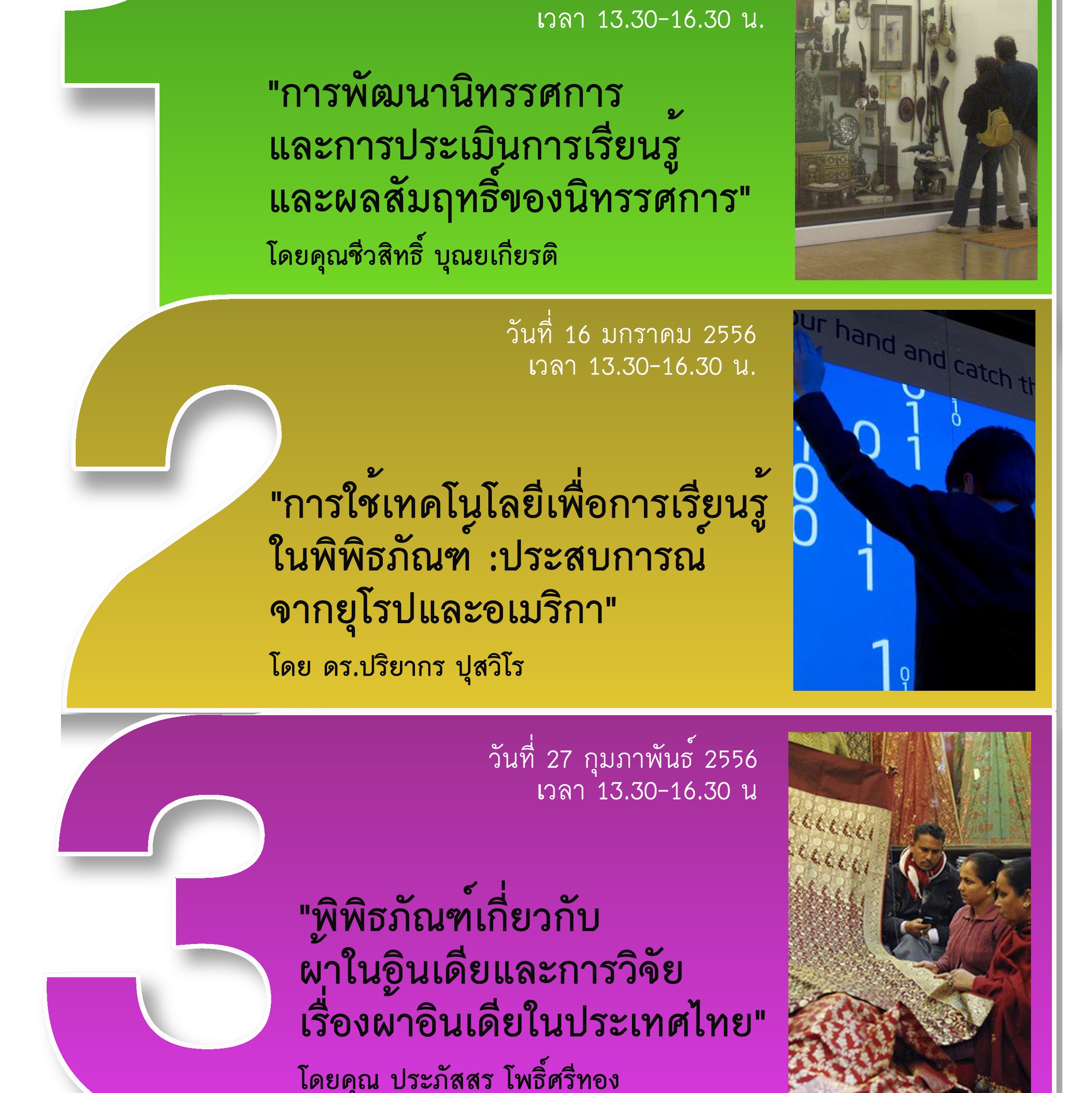 ขอเชิญผู้สนใจฟังการบรรยายพิเศษในรายวิชา ม.443 การวิจัยและออกแบบนิทรรศการพิพิธภัณฑ์ วันที่ 9, 16 มกราคม และ 27 กุมภาพันธ์ 2556