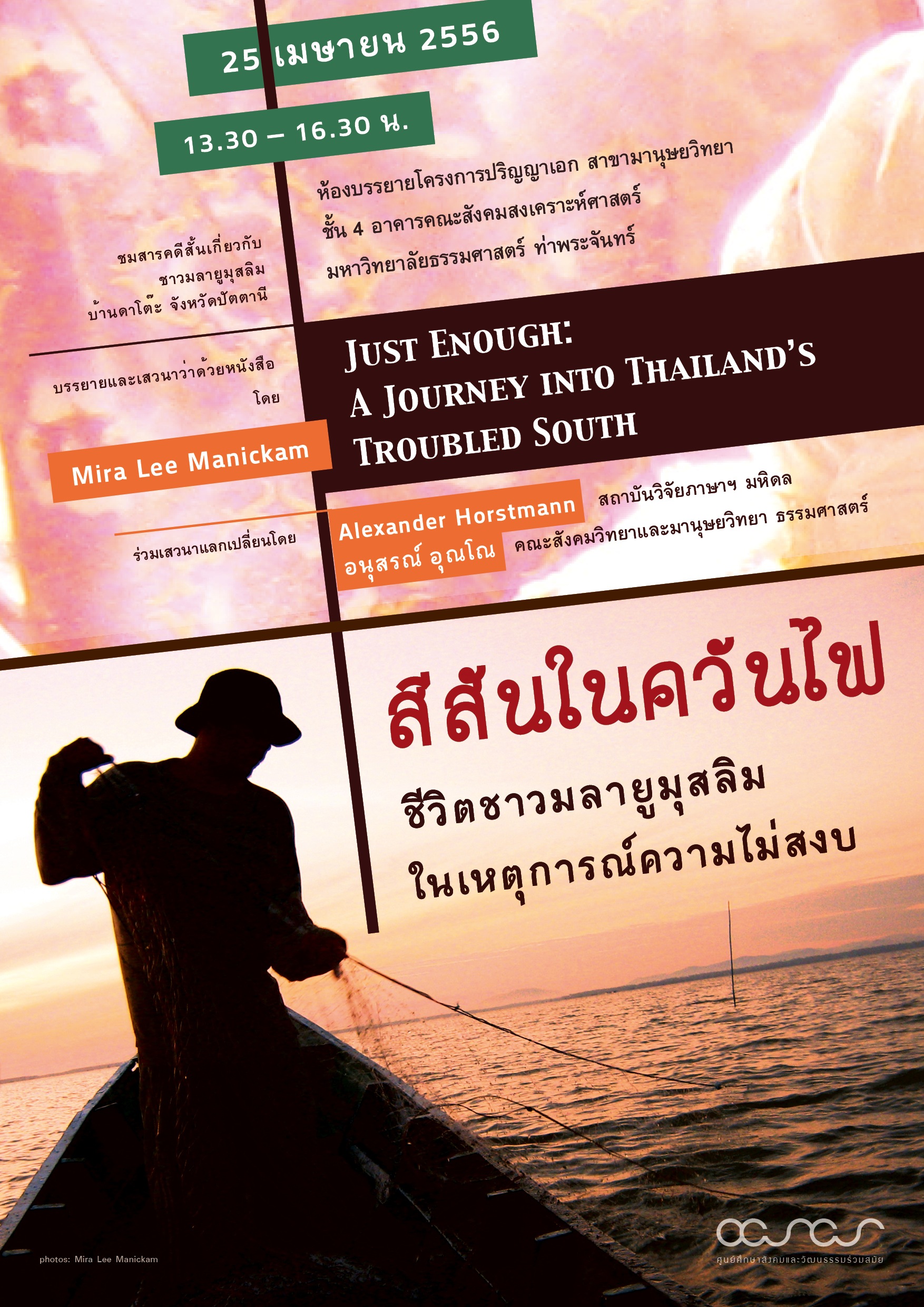 ศูนย์ศึกษาสังคมและวัฒนธรรมร่วมสมัย คณะสังคมวิทยาและมานุษยวิทยา มหาวิทยาลัยธรรมศาสตร์ มีพันธกิจในการเสริมสร้างความรับรู้ ความเข้าใจ และการเคารพในความแตกต่างหลากหลายของชีวิตผู้คนกลุ่มต่างๆ ในสังคม จึงได้จัดฉายสารคดีขนาดสั้นและการบรรยายเกี่ยวกับหนังสือ Just Enough: A Journey into Thailand’s Troubled South โดย Mira Lee Manickam พร้อมด้วยการร่วมแลกเปลี่ยนและอภิปรายในประเด็นสืบเนื่องโดยนักวิชาการที่ศึกษาชีวิตและสังคมชาวมลายูมุสลิมในจังหวัดชายแดนภาคใต้ เพื่อให้การกล่าวถึงผู้คนกลุ่มนี้มีความกว้างขวางและครอบคลุมยิ่งขึ้น อันจะนำไปสู่ความเข้าใจและการเคารพในความแตกต่างหลากหลายของพวกเขาที่สอดคล้องกับเงื่อนไขและความเป็นจริงในชีวิตประจำวัน
