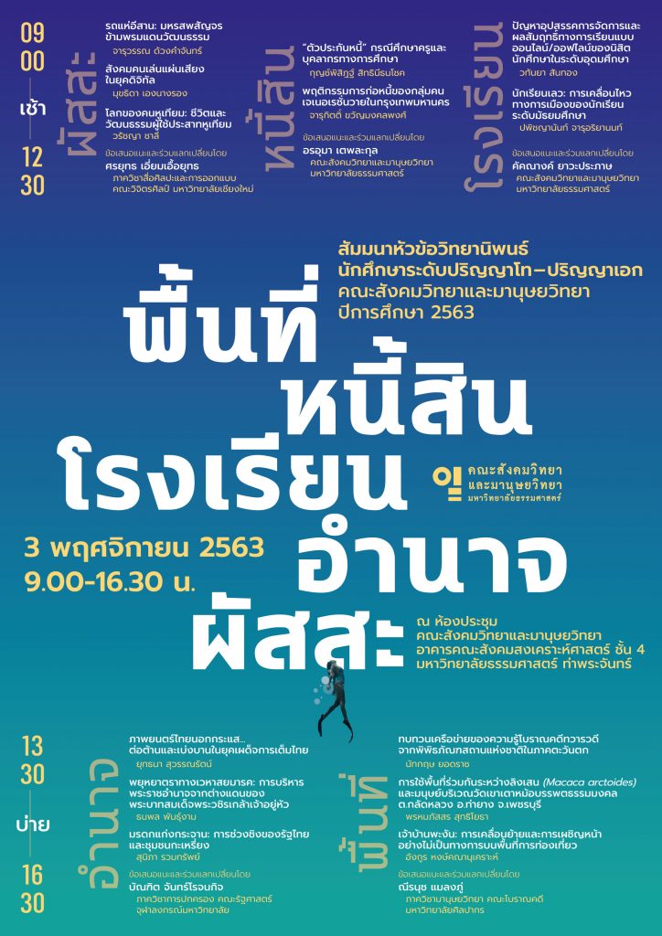 สัมมนาหัวข้อวิทยานิพนธ์นักศึกษาระดับปริญญาโท–ปริญญาเอก ปีการศึกษา 2563 “พื้นที่ หนี้สิน โรงเรียน อำนาจ ผัสสะ”