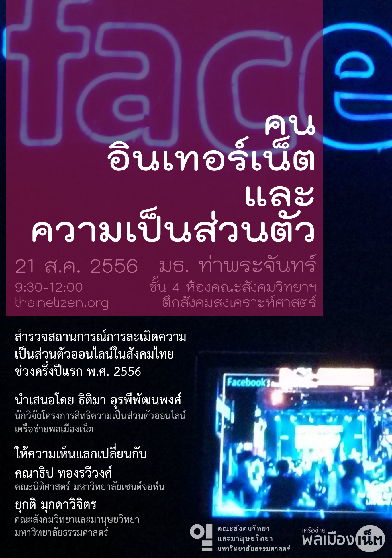 ด้วยเหตุนี้เครือข่ายพลเมืองเน็ตและฝ่ายวิจัย คณะสังคมวิทยาและมานุษยวิทยา มหาวิทยาลัยธรรมศาสตร์ จึงเห็นว่าเป็นโอกาสดีที่จะจัดการสัมมนานำเสนอผลสำรวจสถานการณ์การละเมิดความเป็นส่วนตัวออนไลน์ในสังคมไทยช่วงครึ่งปีแรก ของพ.ศ. 2556 ขึ้นเพื่อเป็นเวทีในการสร้างความรู้ความเข้าใจต่อสาธารณะ ถึงความเปลี่ยนแปลงทางเทคโนโลยีและสังคมของความเป็นส่วนตัว เพื่อร่วมกันหาแนวทางการคุ้มครองความเป็นส่วนตัวต่อไป