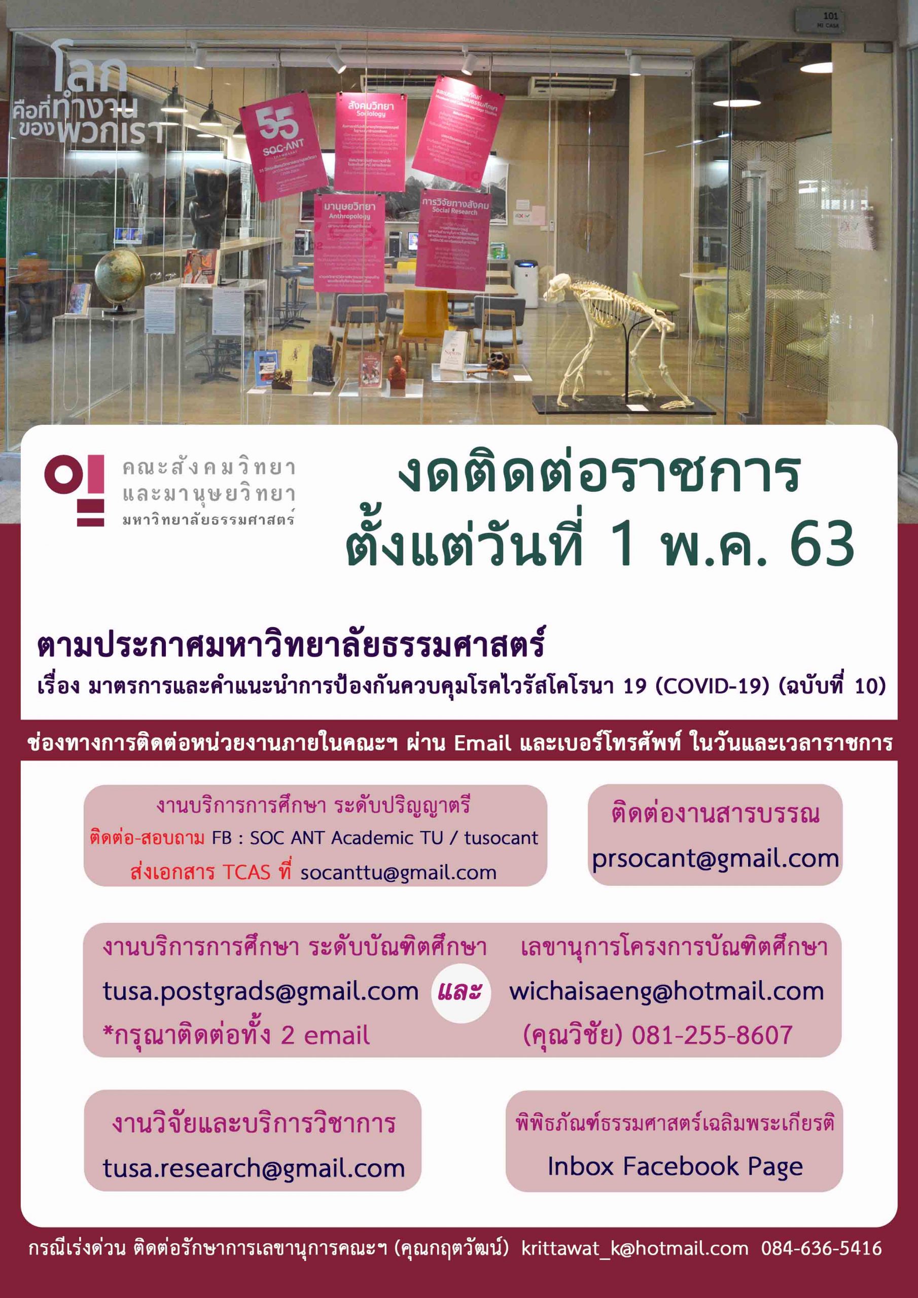 คณะสังคมวิทยาและมานุษยวิทยา มหาวิทยาลัยธรรมศาสตร์ ขอแจ้งช่องทางการติดต่อในระหว่างมาตรการการควบคุมโรคไวรัสโคโรนา 19 (COVID-19) (ฉบับที่ 10)