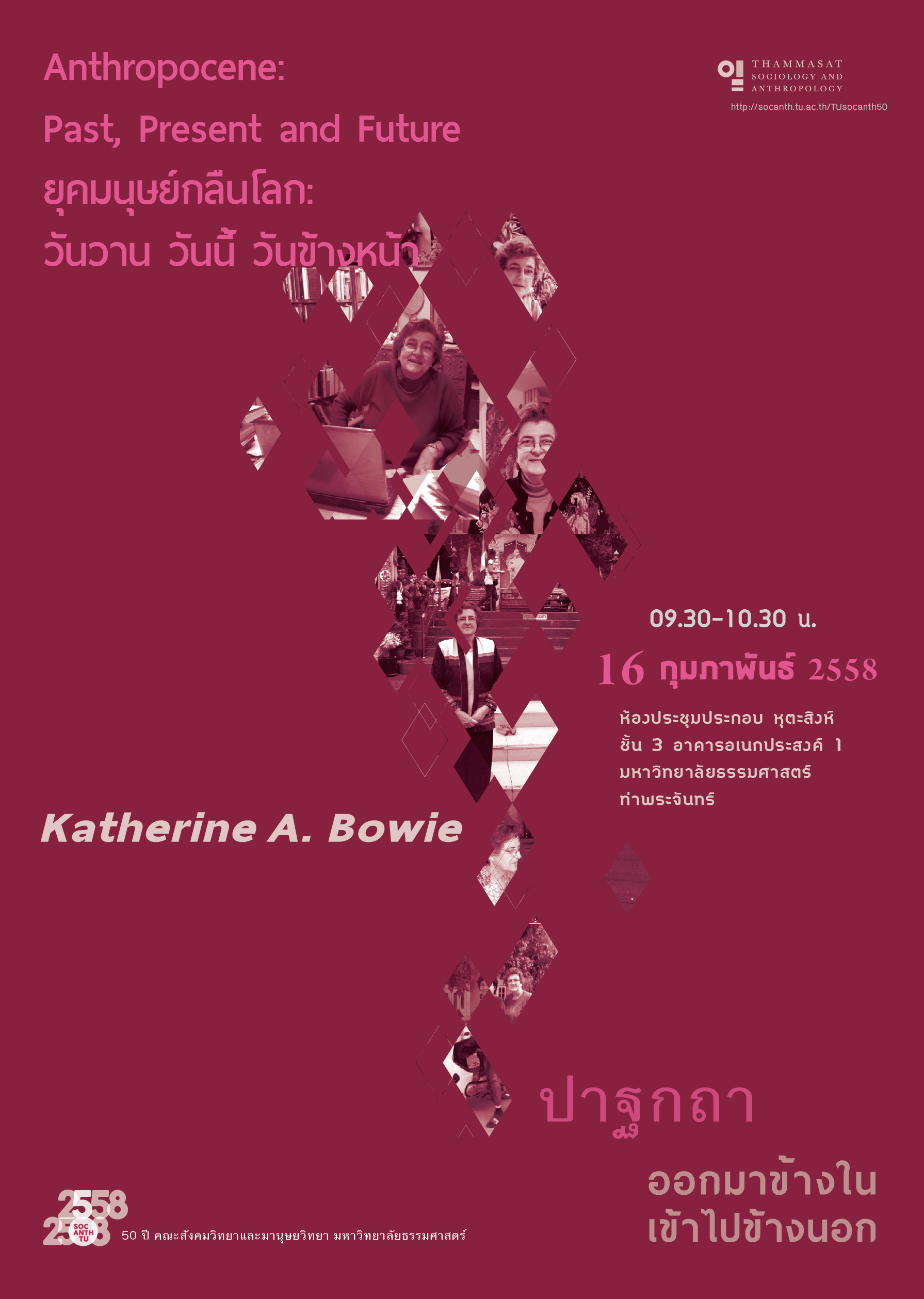 The Quaternary period of the Earth’s history is divided into three epochs: the Pleistocene, the Holocene, and now the Anthropocene. The Pleistocene, which began about 2.5 million years ago, was the time of glaciers and early humans. The Holocene, which began about 11,700 years ago, saw the domestication of agriculture. The term “Anthropocene” was first used in print in 2000 is a new term to describe the global impact of industrialization and resultant climate change. Katherine Bowie’s talk will locate Thammasat’s Department of Sociology and Anthropology in the context of global flows of ideas– past, present and future–in the era of the Anthropocene.