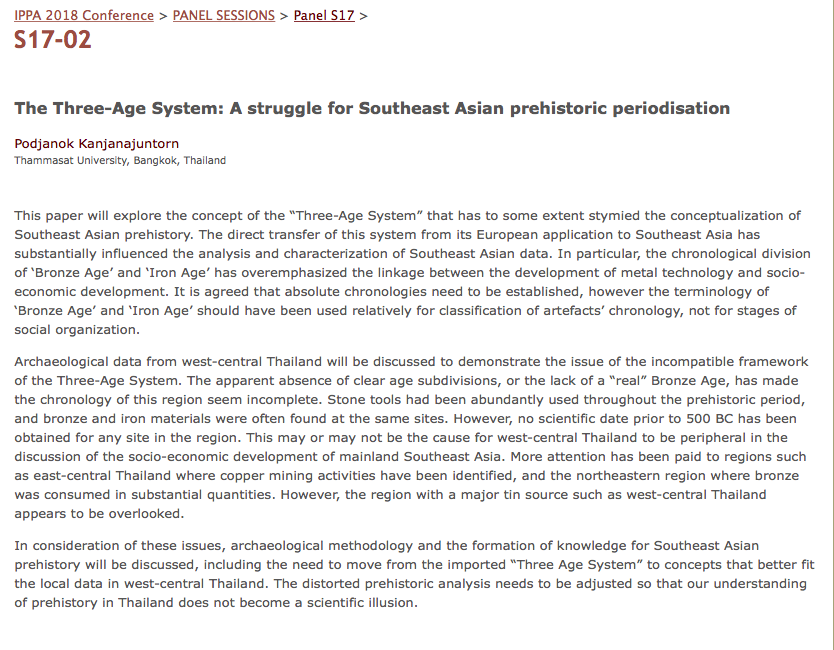 In consideration of these issues, archaeological methodology and the formation of knowledge for Southeast Asian prehistory will be discussed, including the need to move from the imported “Three Age System” to concepts that better fit the local data in west-central Thailand. The distorted prehistoric analysis needs to be adjusted so that our understanding of prehistory in Thailand does not become a scientific illusion.