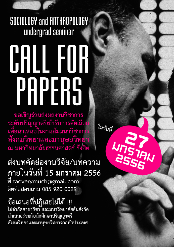 ขอเชิญร่วมส่งผลงานวิชาการ งานวิจัย/บทความ ที่เขียนขึ้นในระหว่างศึกษาระดับปริญญาตรี โดยไม่จำกัดสาขาวิชา และมหาวิทยาของเจ้าของผลงาน เข้ารับคัดเลือกเพื่อนำเสนอในงานสัมมนาวิชาการสังคมวิทยาและมานุษยวิทยาระดับปริญญาตรี ซึ่งจะจัดขึ้นในวันที่ 27 มกราคม 2556 ณ คณะสังคมวิทยาและมนุษยวิทยา มหาวิทยาลัยธรรมศาสตร์ ศูนย์รังสิต