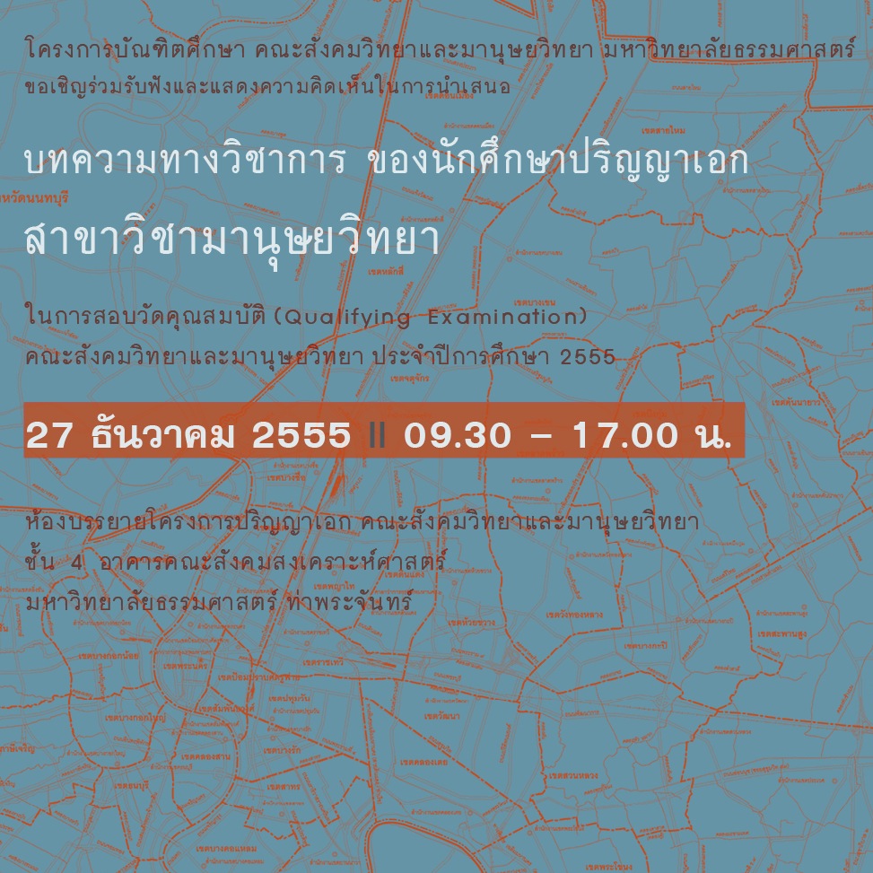 ขอเชิญร่วมรับฟังและแสดงความคิดเห็นในการนำเสนอบทความทางวิชาการของนักศึกษาปริญญาเอก สาขาวิชามานุษยวิทยา ในการสอบวัดคุณสมบัติ (qualifying examination) คณะสังคมวิทยาและมานุษยวิทยา ประจำปีการศึกษา 2555
