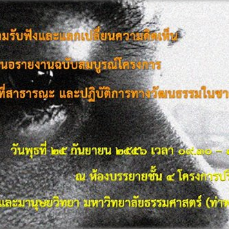 ขอเชิญรับฟังและร่วมแลกเปลี่ยนความคิดเห็น ในการนำเสนอรายงานฉบับสมบูรณ์ ของโครงการวิจัย “ผู้คน ความรู้สึกไม่มั่นคง พื้นที่สาธารณะ และปฏิบัติการทางวัฒนธรรมในชายแดนใต้” วันที่ 24 กันยายน 2556 เวลา 09.30-12.00 น.